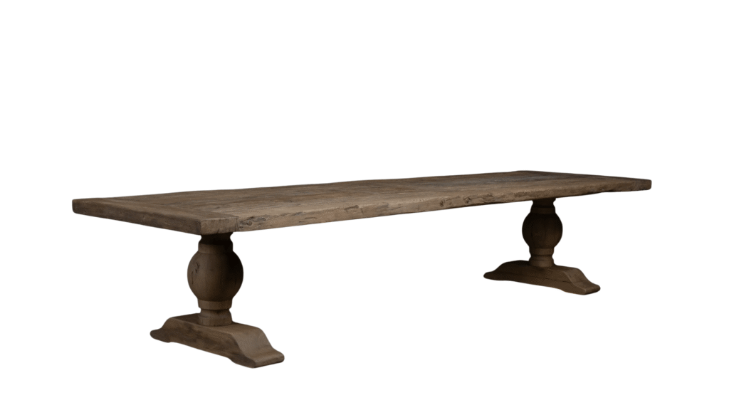 Nous travaillons exclusivement des bois de qualité chargés d'histoire. Patine naturelle, traces de vie et veinage marqué font de chaque table une création impossible à reproduire.