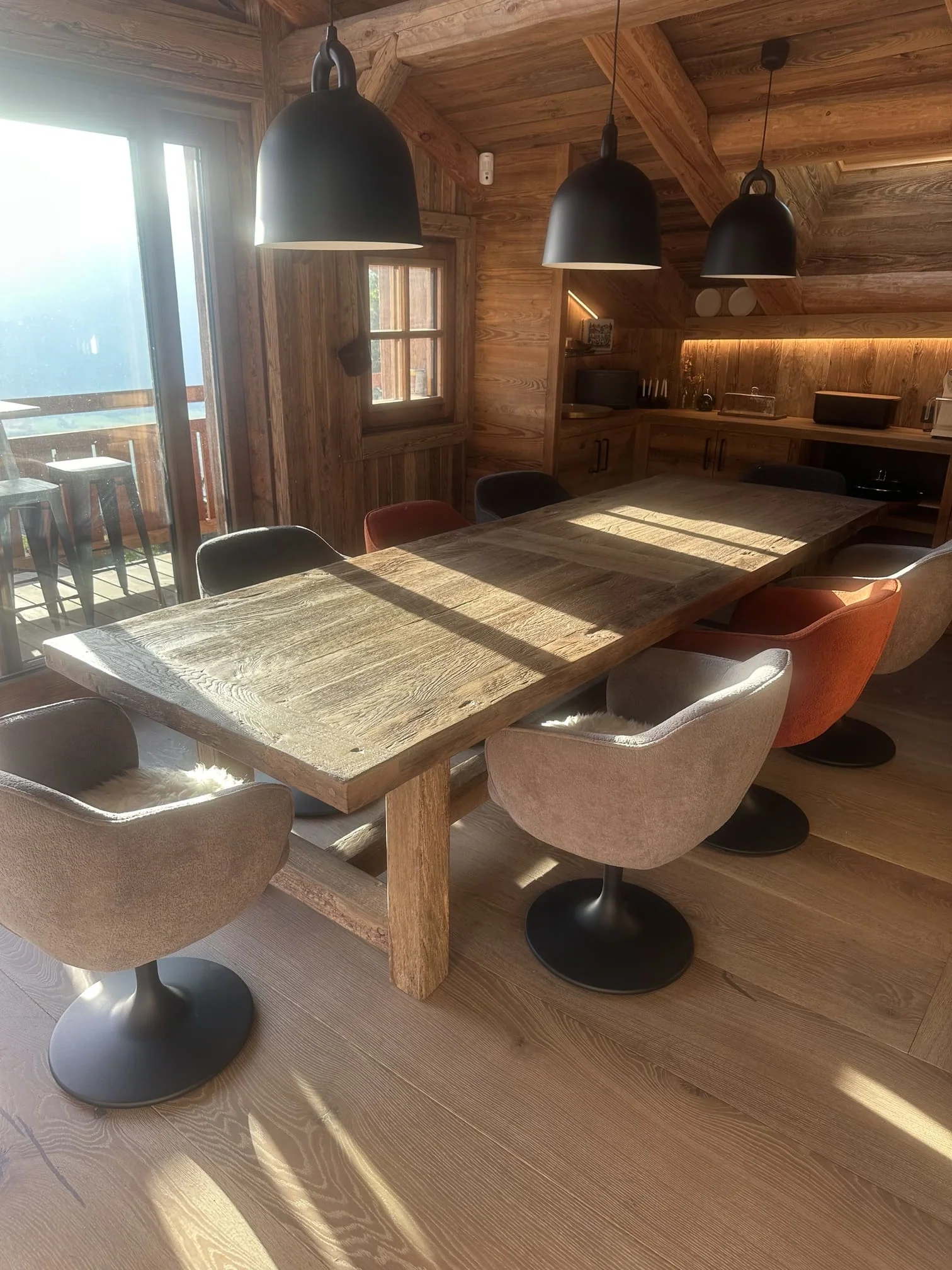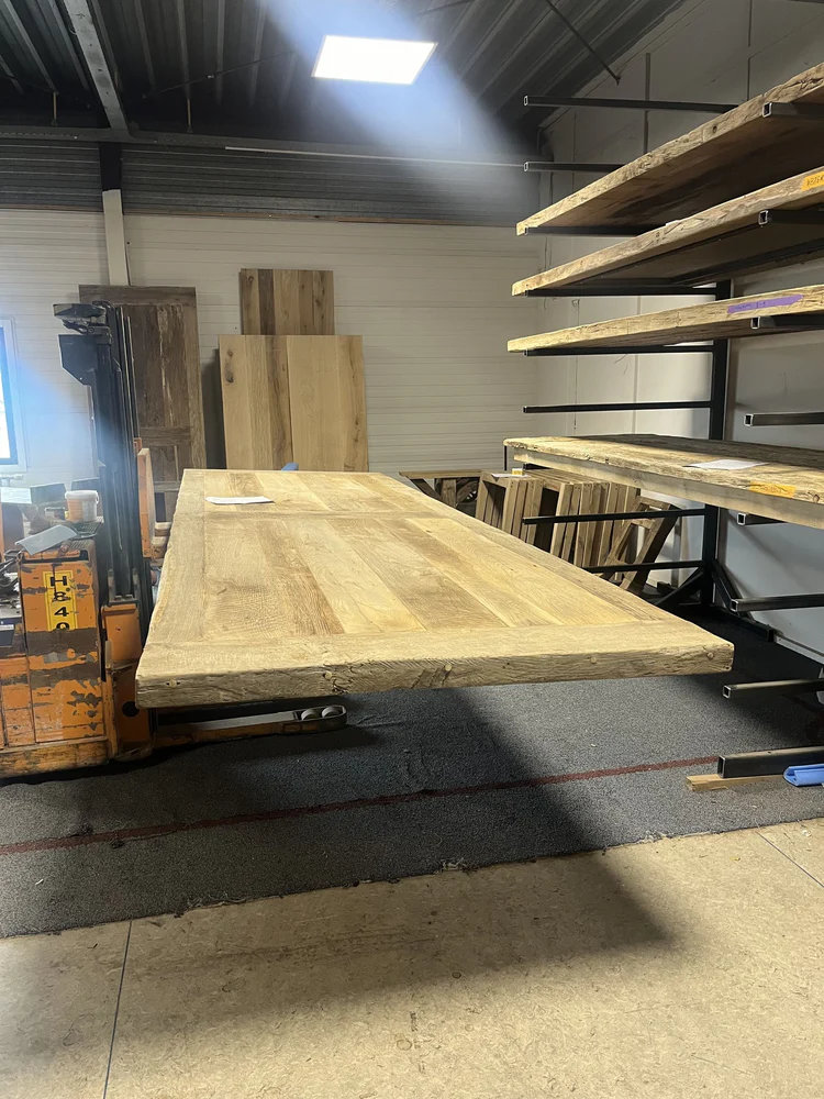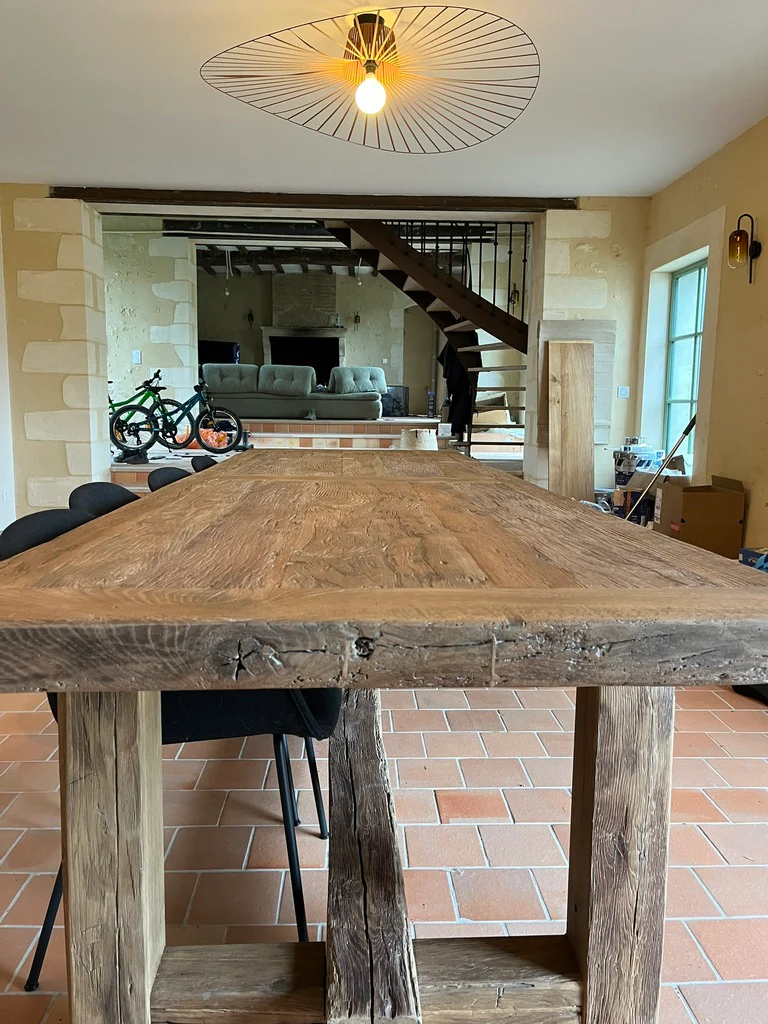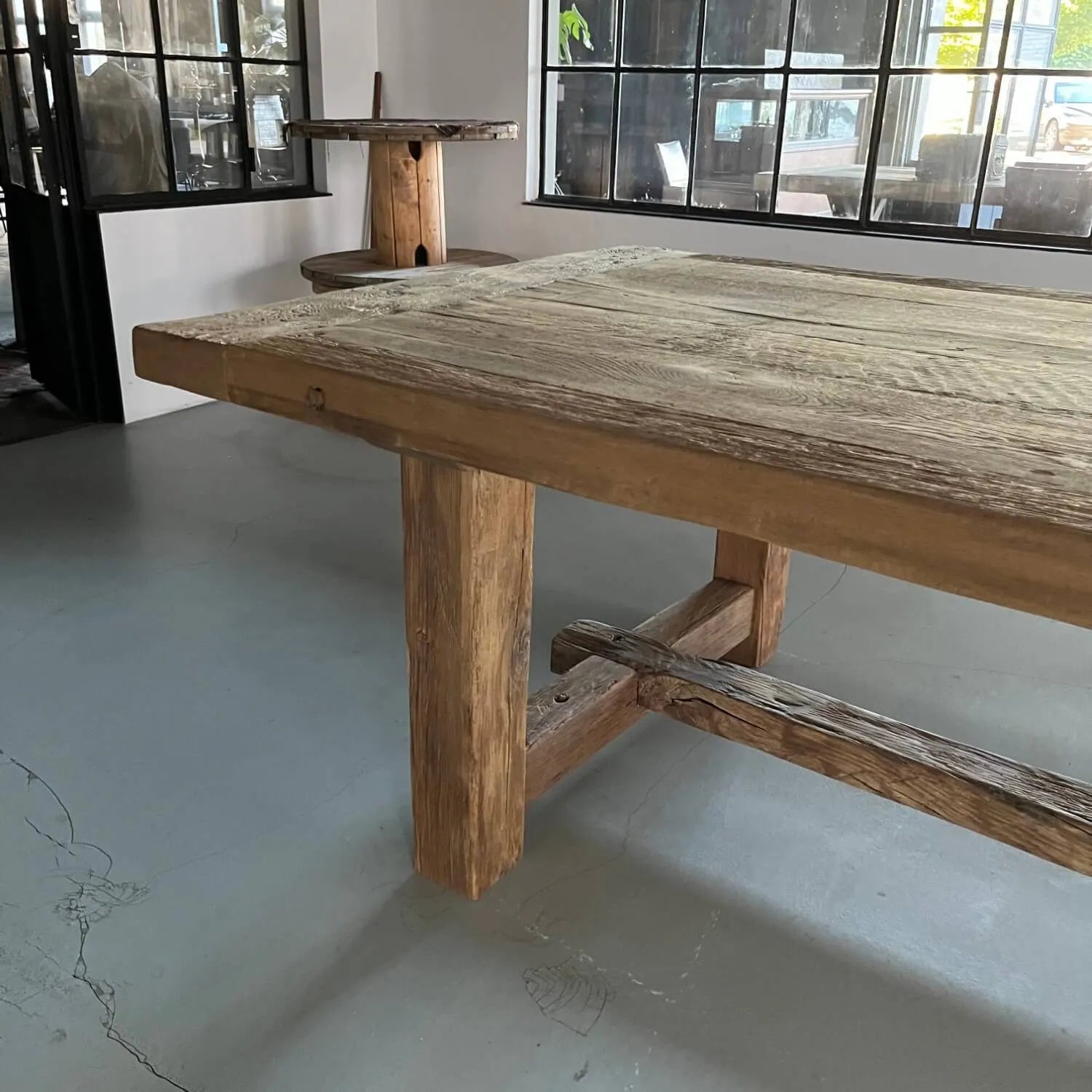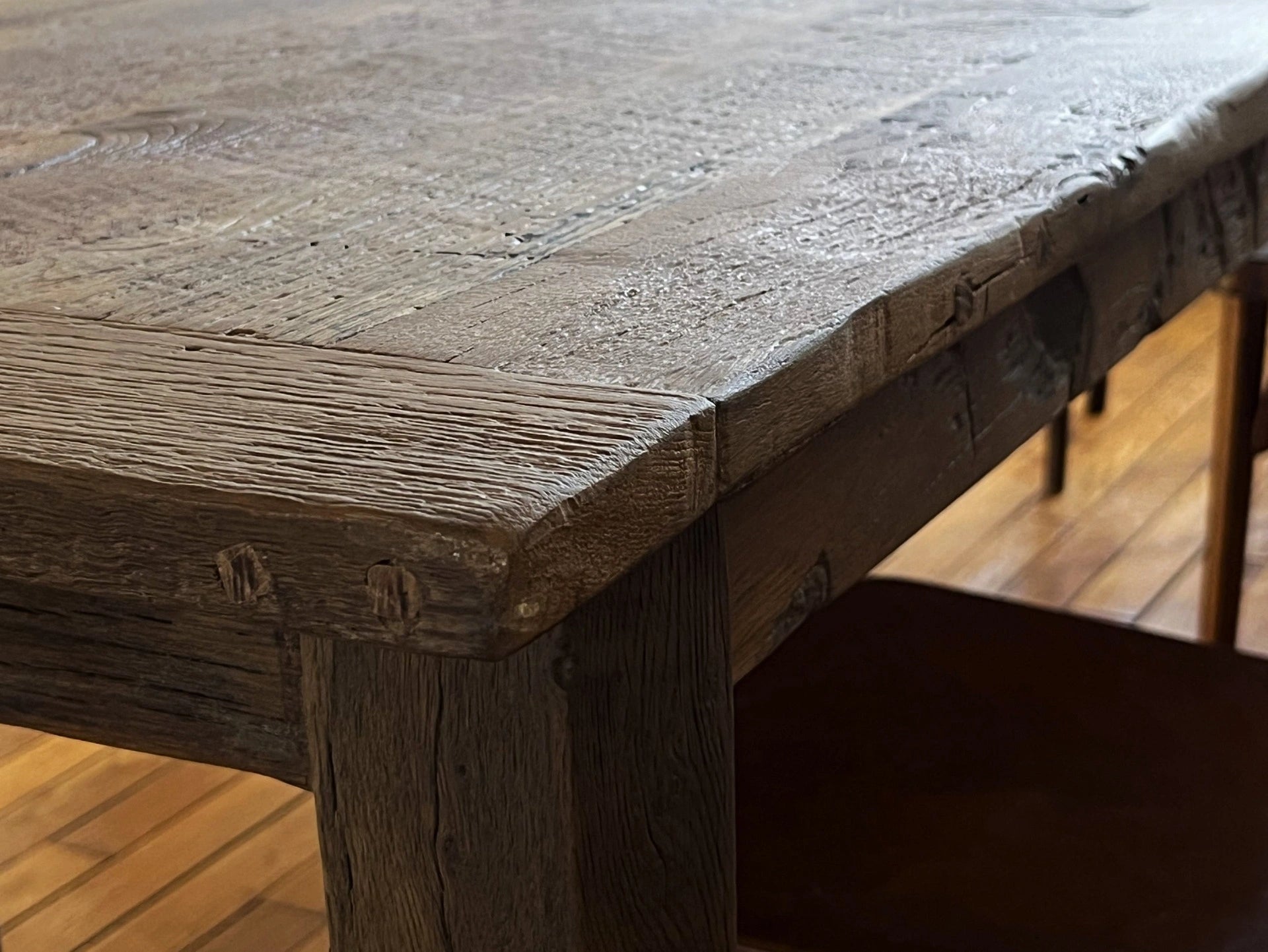 Chaque plateau de la table Kingstone est façonné dans un chêne massif ancien soigneusement sélectionné. L’épaisseur de 7 cm offre une stabilité remarquable et met en valeur la patine naturelle du matériau. Les marques du temps sont conservées, révélant un caractère unique.